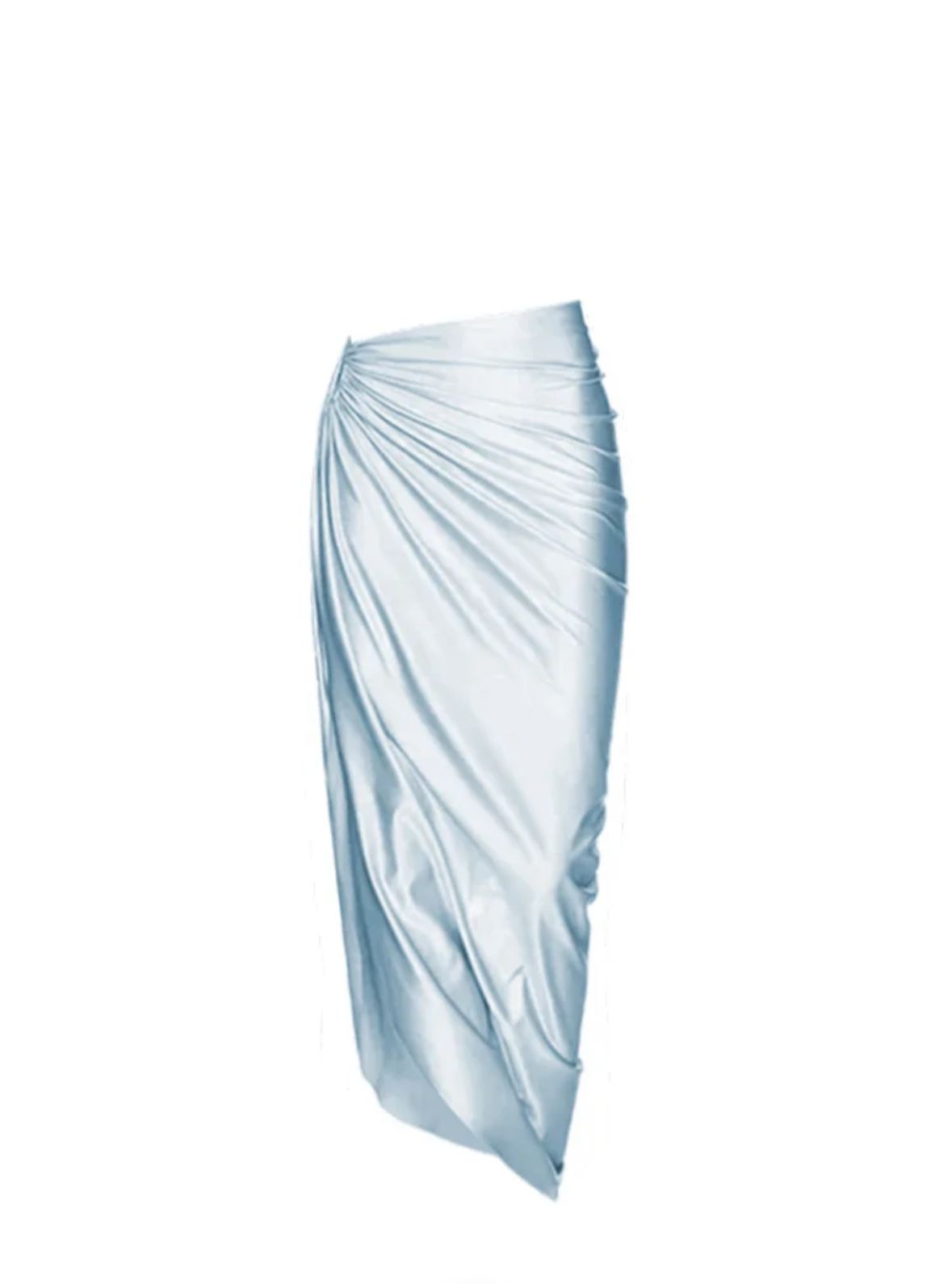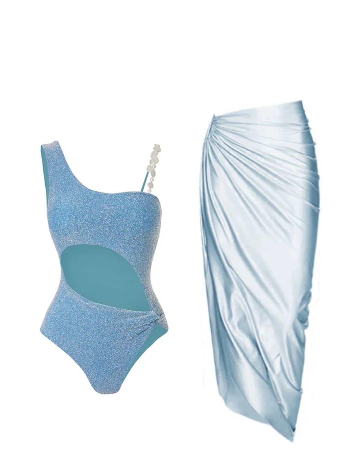 Designed to embody ethereal charm and effortless sophistication, this one-shoulder wrap dress is a vacation dream. The shimmering blue bodice provides a hint of sparkle, while the flowing drape cascades over one side and cinches at the hip with a chic ring detail. A high slit adds an element of drama and allure, perfect for beach soirées, yacht parties, or golden hour photoshoots.