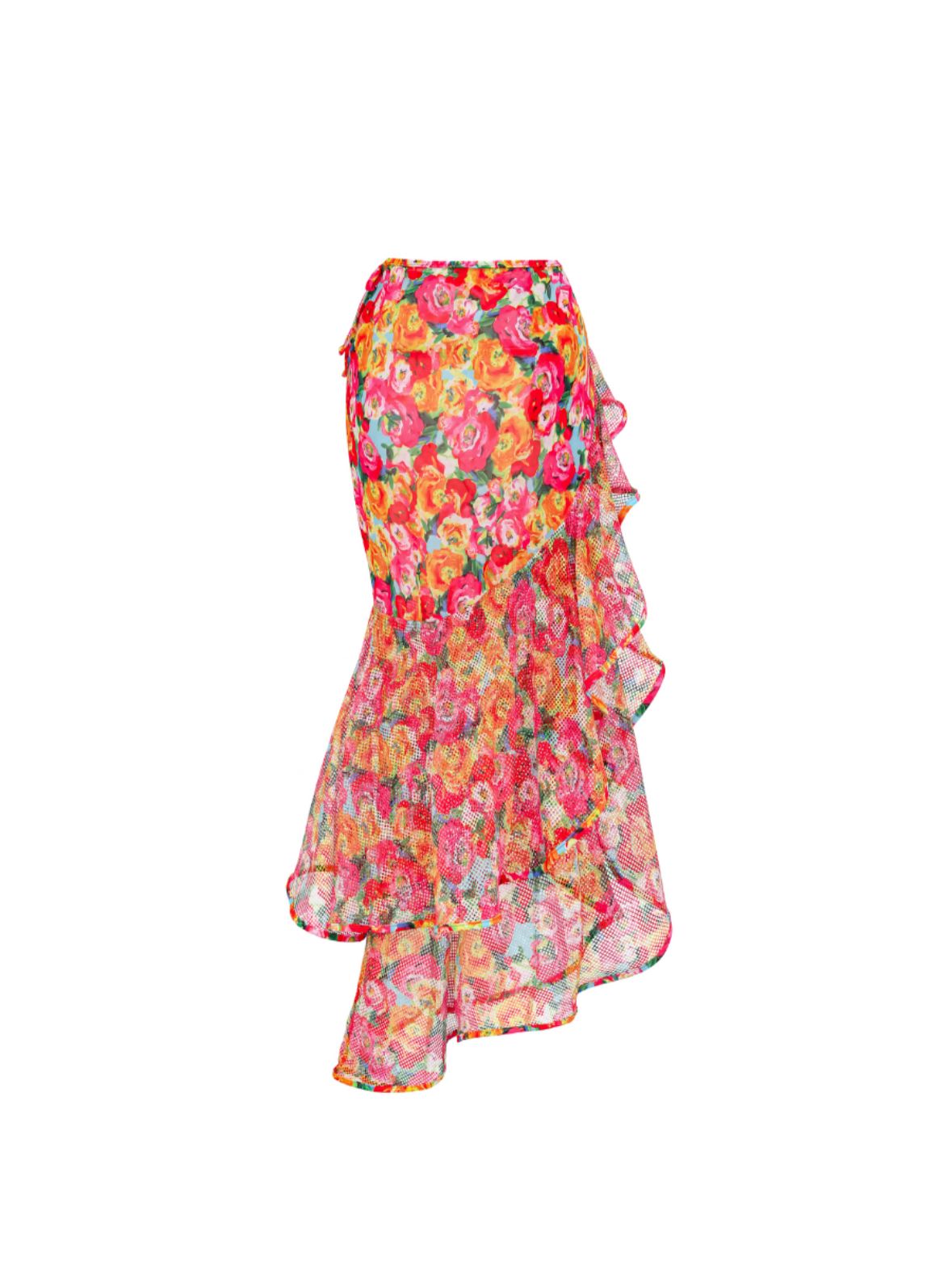 This two-piece ensemble includes a supportive, sweetheart neckline crop top with playful ruffled sleeves and a flowy high-waisted wrap skirt adorned with cascading ruffles. The bold, multicolored floral print radiates tropical charm, while the flattering fit ensures you’ll turn heads with every step.