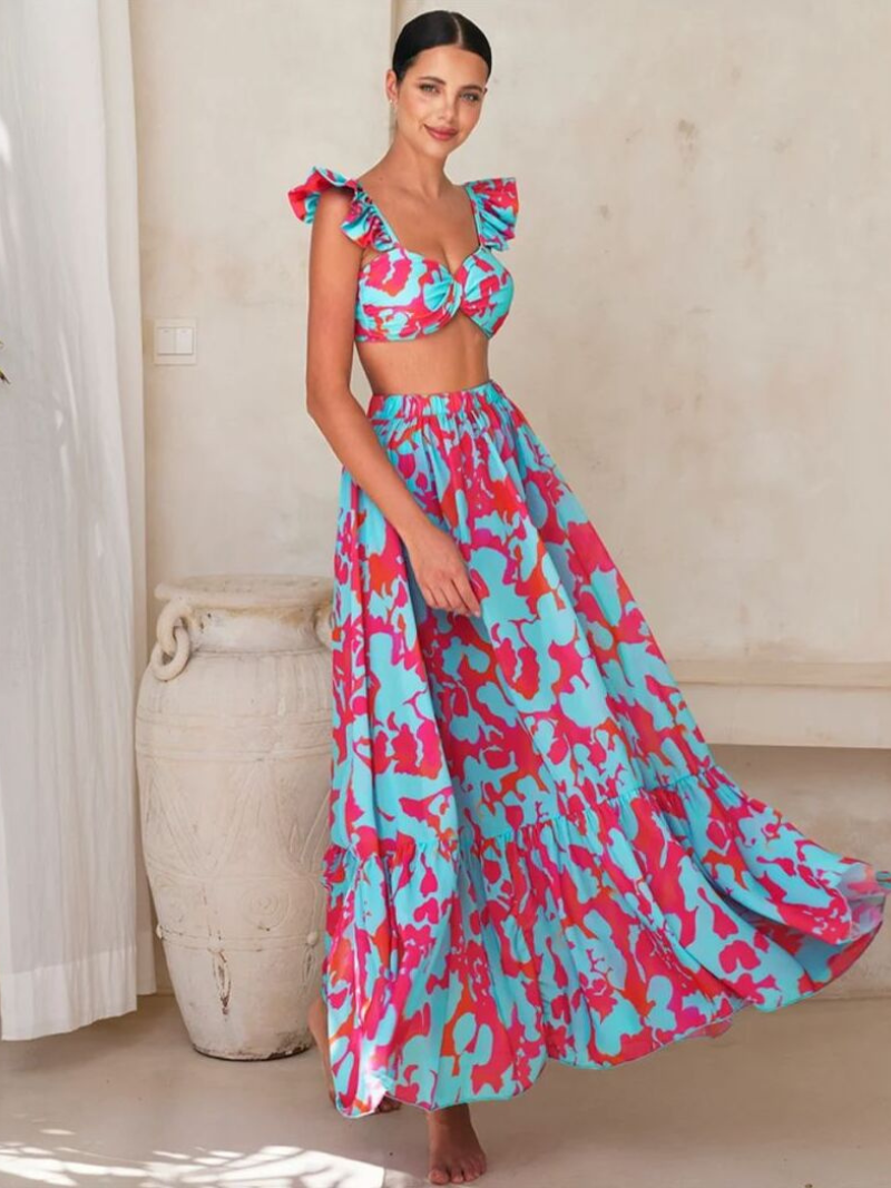 The Sunset Splash Ruffle Co-Ord Set combines vibrant colors and expert design for a standout summer look. Featuring a turquoise blue, flamingo pink, and coral red abstract print, the set includes a ruffle-sleeve crop top with a sweetheart neckline and twist-front detail that enhances your silhouette. The high-waisted maxi skirt offers a flowing fit with a tiered hem, adding movement and volume. Perfect for sunny days, this coordinated outfit balances playful style with flattering cuts for confident, effortless wear.